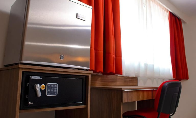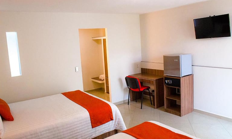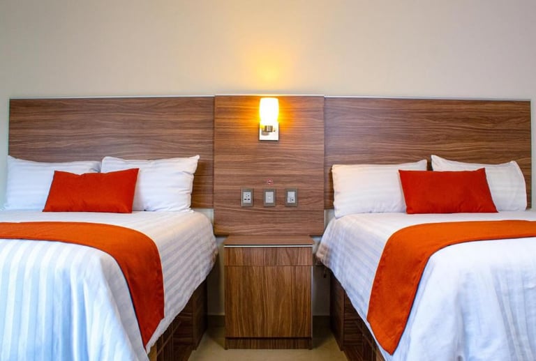 Perfecta para dos personas, nuestra Habitación Twin Doble ofrece dos camas matrimoniales, baño privado y servicios esenciales para una estancia tranquila. Con wifi sin costo, TV con pantalla plana y caja de seguridad compatible con laptop, este espacio combina funcionalidad y comodidad para que te sientas bienvenido desde tu llegada.